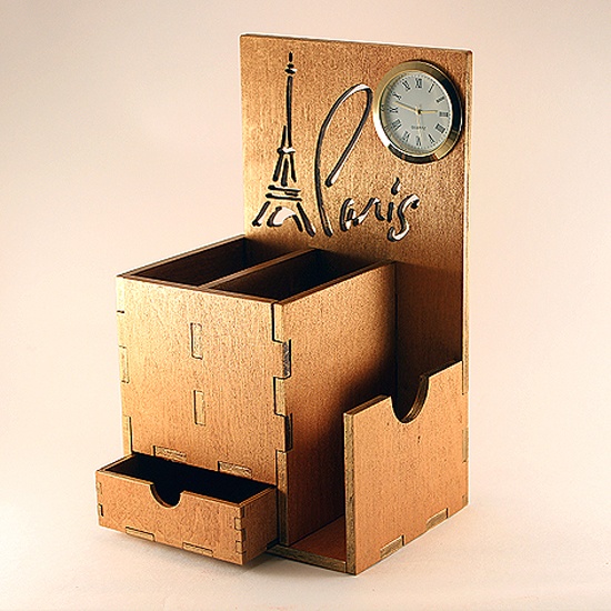 Подставка под канцелярию Париж и настольные часы в одном изделии - два отделения для хранения ручек, карандашей, ножниц, линеек. Отделение для бумажных записок и конечно ящичек для хранения скрепок, ластиков и другой мелочи.